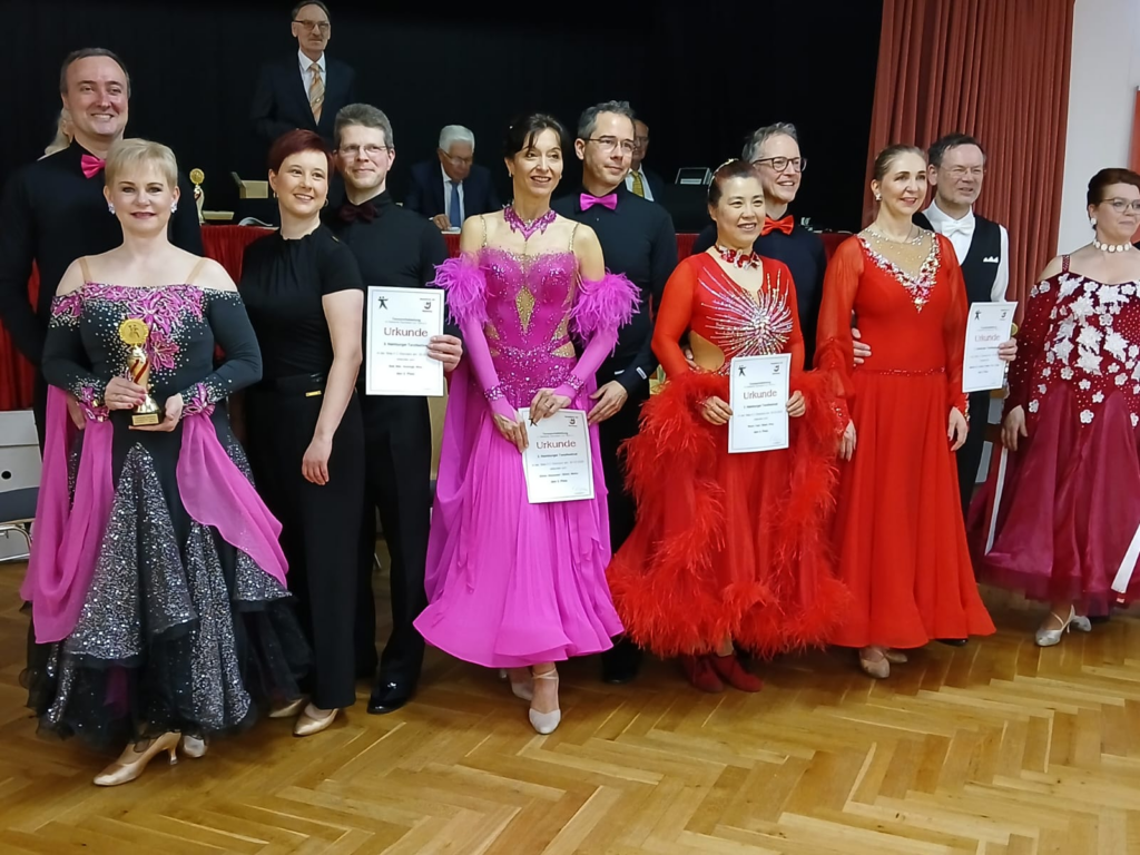 Von Platz 3 traute sich das andere Moerser Paar Thorsten Mattheus und Elke Mattheus-Staack nicht zu träumen. In der Masters IIIS Klasse hatten sich unter anderem Stella und Ralf Lämmermaier angekündigt , die für den niederländischen Verein Dansstudio Paul & Cynthia an den Start gehen und 2023 in Mailand zum zweiten Mal Weltmeister ihrer Klasse geworden waren – weitere sensationelle Ergebnisse der beiden sind z.B. die Endrundenteilnahme beim wichtigsten Turnier der Welt in Blackpool. Stella und Ralf sind mit den Moersern befreundet und und kamen natürlich zuverlässig in das für Tänzer, die die Weltbühne kennen, kleine Moerser Clubheim. Das war schon großes Kino die zwei tanzen zu sehen und so konnten Stella und Ralf am Ende auch den Titel des Sparkasse am Niederrhein Pokals souverän und mit allen Einsen verteidigen. Träumte da nicht noch wer? Stimmt, im Schatten der ganz Großen tanzte das Moerser Paar Thorsten und Elke ein sensationelles Turnier und errang den größten Erfolg ihrer bisherigen Tanzkarriere und stand am Ende neben den Weltmeistern auf dem Treppchen. Herzlichen Glückwunsch!